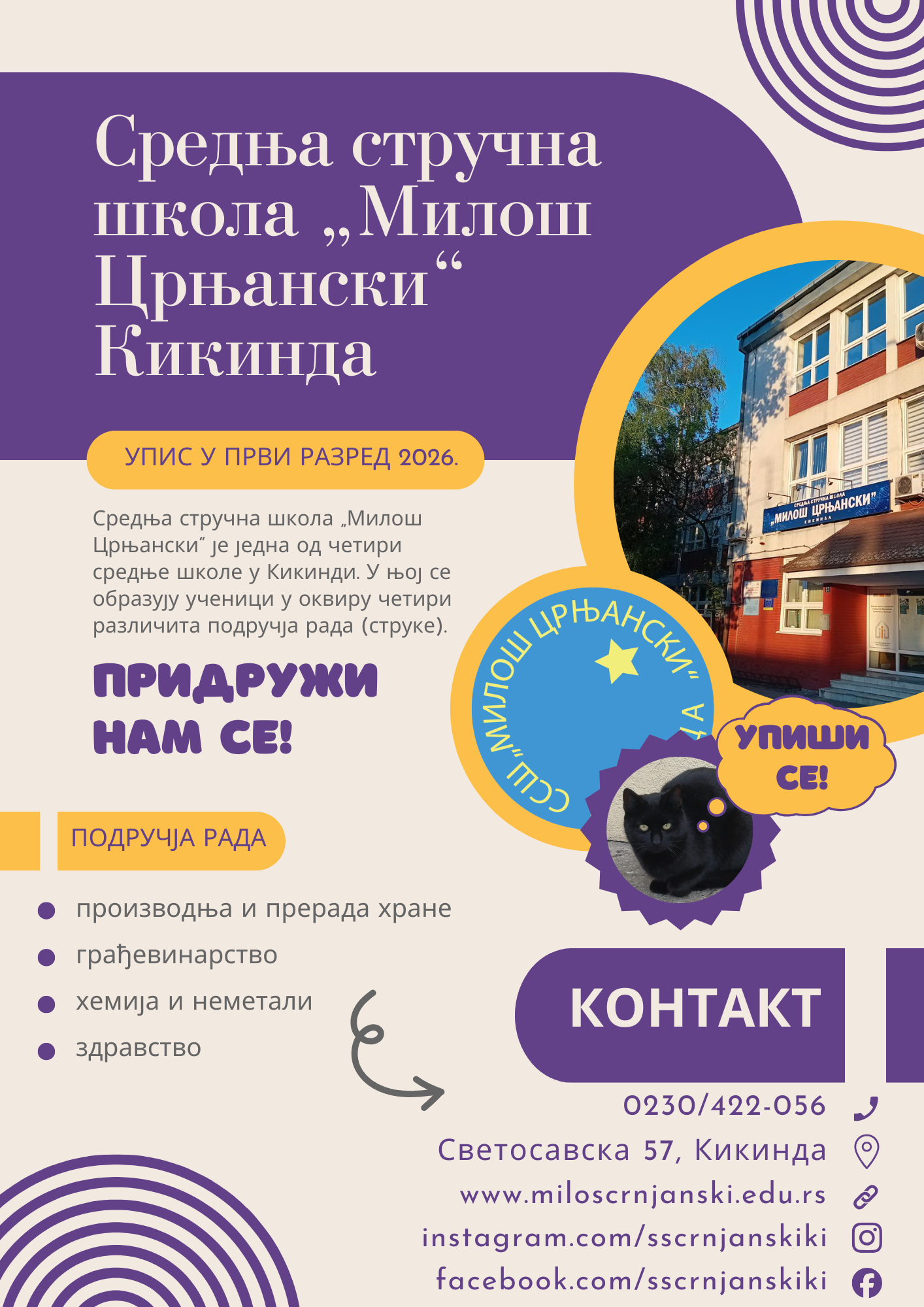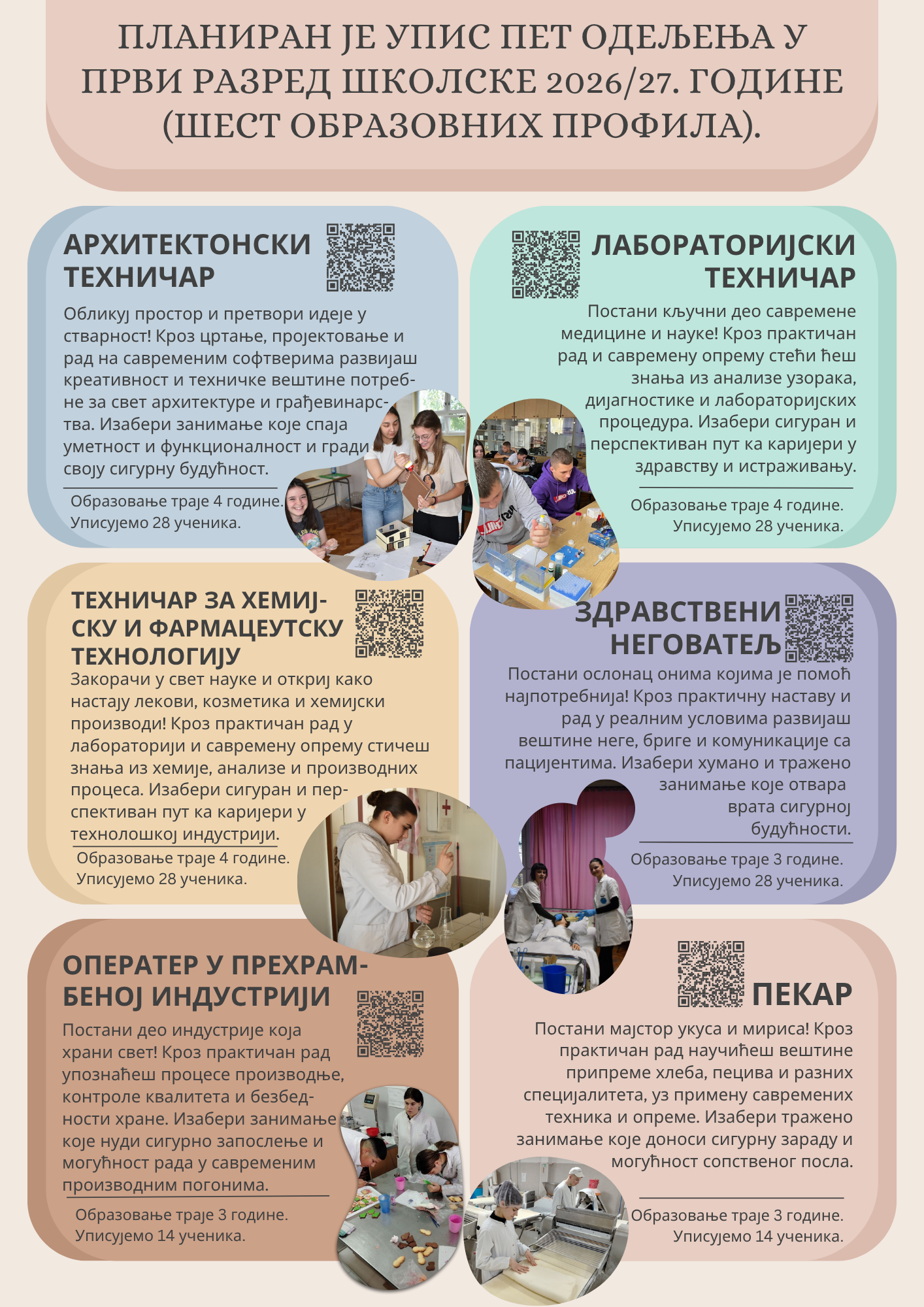 Дајемо табеларни приказ планираних образовних профила за упис редовних ученика у нашу школу са слободним бројем места за упис, према Конкурсу за упис у школску 2026/2027. годину.